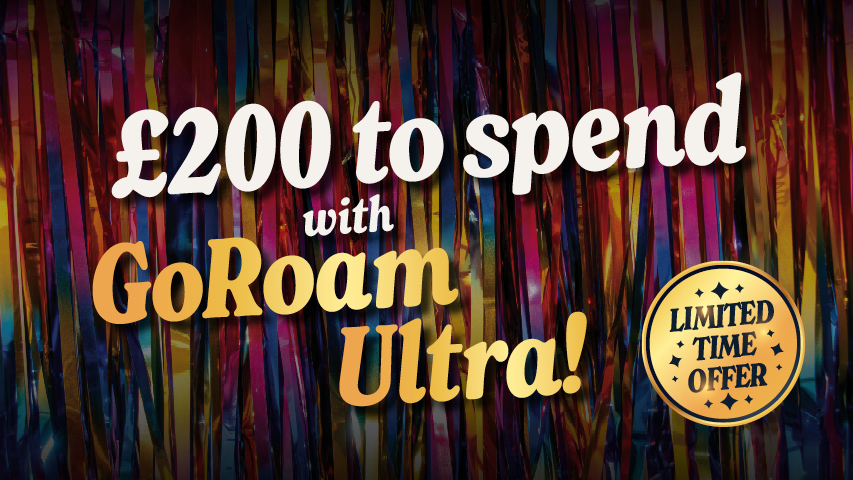 GoRoam Ultra only: 40GB EU data across 37 countries (vs. GoRoam Unlimited 20GB previously). Unlimited On-Net data subject to fair use. £200 gift available with new GoRoam tariff plans over 24/36 months; ends 31 January 2026 or when the £100,000 gift pot is fully allocated, whichever comes first; redeemable in-store only; no cash alternative.