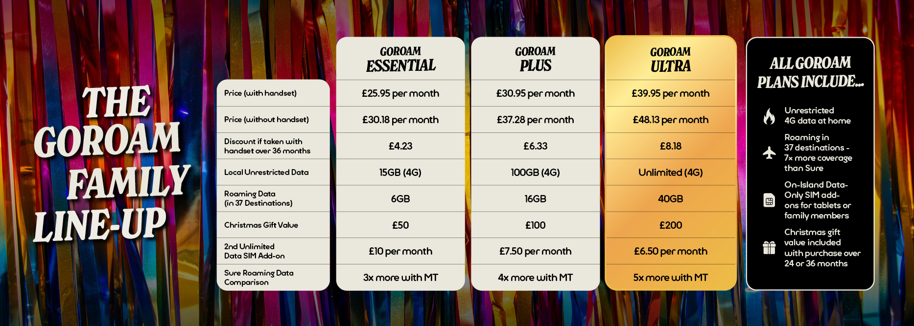 Competitor comparison: Roaming Data: Sure Unlimited Max includes 8GB roaming data; Unlimited Standard 4GB; Unlimited Basic 2GB – all covering the UK, RoI, CI & France (Sure website, Oct 2025). GoRoam Ultra includes 40GB roaming data across 37 destinations. Fair usage applies.